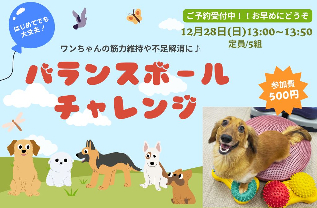 しつけ方教室開催イベント 暖かい教室で遊ぼう!バランスボールチャレンジご予約受付中!! teketekewans 2025年12月10日 12月もやります♪バランスボールチャレンジ!! はじめてでも乗れちゃう♪ 体幹も鍛えられて、運動不足解消に👍 ぜひ一度チャレンジしてみてくださいね😀