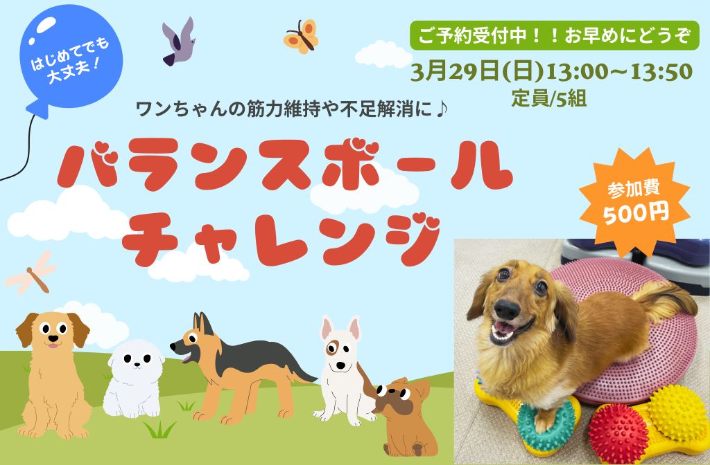 しつけ方教室開催イベント 体幹を使って遊ぼう!バランスボールチャレンジご予約受付中!! teketekewans 2026年3月4日 3月もやります♪バランスボールチャレンジ!! はじめてでも乗れちゃう♪ 体幹も鍛えられて、運動不足解消に👍 ぜひ一度チャレンジしてみてくださいね😀