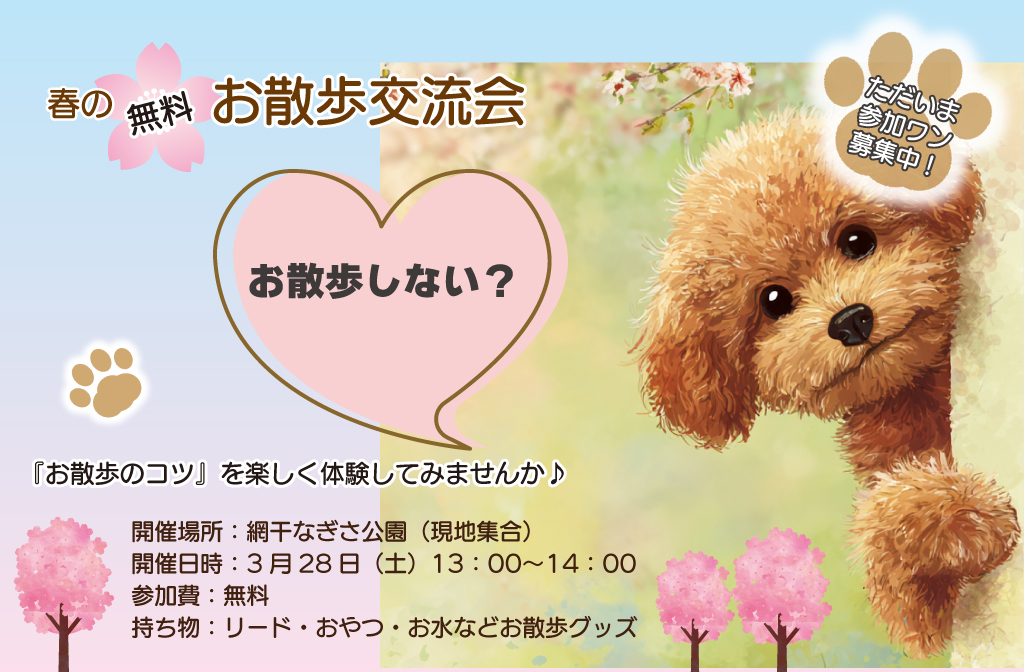 しつけ方教室開催イベント 開催します!無料お散歩会!!一緒に公園をお散歩しましょう♪ teketekewans 2026年3月4日 だいぶ春めいてきましたね! 3月も無料お散歩会を開催します♪ ゆったりと公園をみんなで歩きながら お散歩を楽しんでみませんか?